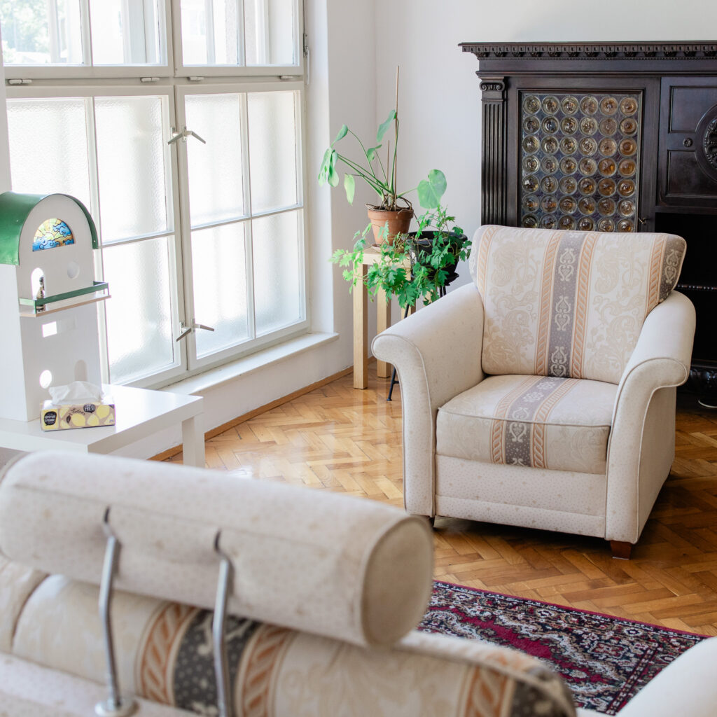 Terapevtski prostor je zasnovan tako, da zagotavlja prijetno in sproščeno okolje. Prostor je svetel, topel in opremljen z udobnimi sedali, kar prispeva k dobremu počutju.
