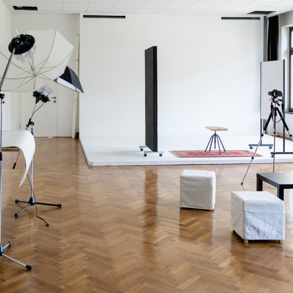 Fotografski studio ponuja sproščujoč in navdihujoč ambient. Opremljen je s črnim in belim ozadjem, ki omogočata ustvarjanje brezčasnih in profesionalnih posnetkov. Svetel prostor z velikimi okni zagotavlja obilico naravne svetlobe skozi ves dan, hkrati pa navdušuje s čudovitim pogledom na reko Savo, ki prostoru doda edinstveno vzdušje.